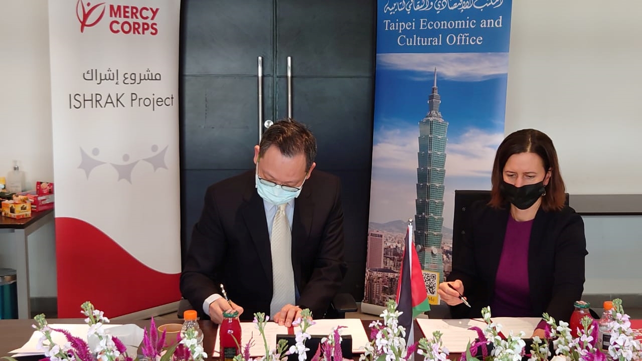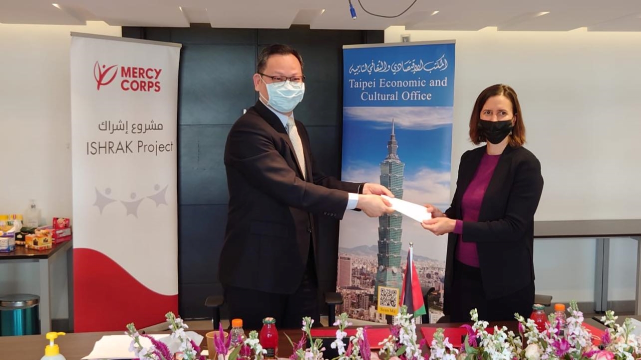 30 November, 2021, on behalf of the government of Republic Of China (Taiwan), Representative Mr. Ismail MAE of Taipei Economic and Cultural Office in Jordan signed the agreement with Mrs. Kari Diener, Country Director of Mercy Corps Jordan to donate 300,000USD to support the second phrase of Mercy Corp’s “Ishrak”: Adolescent Girls’ Empowerment initiative and helps the Syrian refugees in Za’atari and Azraq camp. This is the second contribution to this initiative from Taiwan after donating 250,000USD in August 2020.