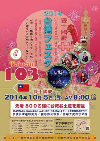 ◆ ◆ ◆ ◆ ◆東京地區僑學各界慶祝 中華民國103年國慶大會 ●時間:10月5日(星期日)●地點:東京中華学校 東京都千代田区五番町十四番地 JR四谷站・地下鉄丸之内線四谷站步行5分鐘 JR市之谷站・地下鉄有楽町線・都営新宿線市之谷站步行6分鐘●節目表 9:00 入場 9 :30 國旗入場 9:40 升旗典禮10:00 慶祝大會10:40 祥獅獻瑞11:00 園遊會開始12:30 遊藝餘興節目15:00 酬賓抽獎活動16:00 閉幕 ※為保護校園操場,請女性來賓避免穿高跟鞋。