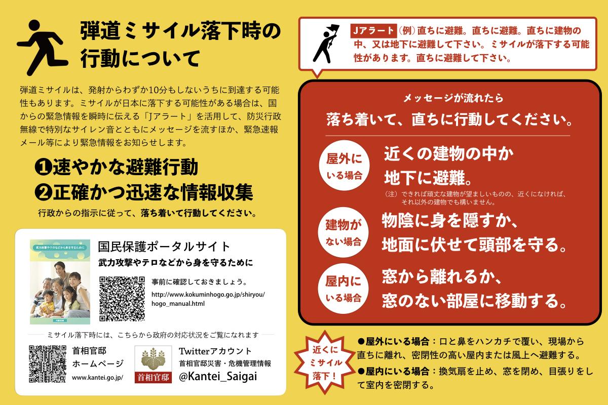 日本政府為使日本住民了解日本受到彈道飛彈等攻擊時,日本政府因應之道及民眾避難方式,設置「內閣官房国民保護ポータルサイト」(國民保護入口網站),該網站主頁如下:
