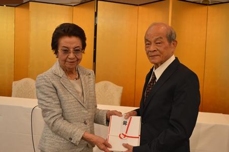 「日本櫻返鄉會」台灣會長黃石城(右)將櫻花以目錄形式致贈給「日本櫻返鄉會」日本名譽會長安倍洋子女士(左)