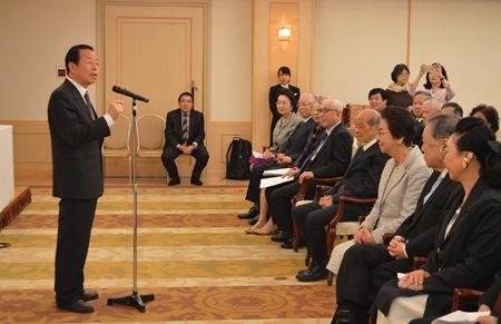 謝長廷・駐日代表(照片第2排左5)、安倍洋子・「日本櫻返鄉會」日本名譽會長〈前排左〉、黃石城・「日本櫻返鄉會」台灣會長〈前排右〉、加瀨英明・「日本櫻返鄉會」日本會長〈第二排左4〉、許世楷・前駐日本代表〈右5〉、趙中正・全日本台灣連合會會長(前排右2)