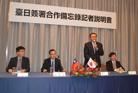 台日簽署合作備忘錄記者說明會 左起 吳俊逸・經濟部智慧財產局科長、林慶鴻・台灣日本關係協會副秘書長、陳世偉・行政院環保署技監兼執行秘書、陳啟榮・行政院農委會農糧署主任秘書