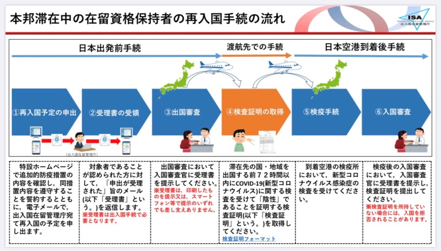 三、持有效在留資格在日本居留之外僑,於今年9月1日之後,可以「再入國許可(包含みなし再入国)」方式出國。出國前須至「出入國及在留管理廳」官網專頁申請出境日本「受理書」,獲准後始可出國。返國流程比照重點二規定。