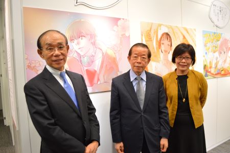 日本台灣交流協會理事長谷崎泰明、駐日代表謝長廷與台灣文化中心主任王淑芳於「謝謝日本」彩稿展合影