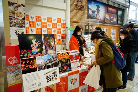 12月3日活動當天,觀光局東京辦事處也同步在西武新宿車站展開一日快閃活動,對來往的民眾發送燈會小提燈、文宣、再開朗報傳單等,周知邊境正式解封。