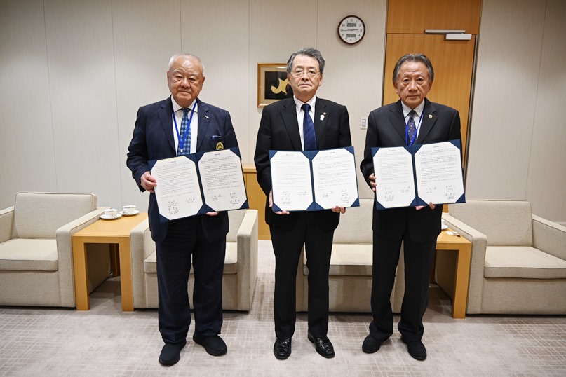 圖說2:簽署合作備忘錄儀式,三三企業交流會理事長林伯豐(左)、台日商務交流協進會理事長黃振進(右)、日本商工會議所會長小林健(中央)。