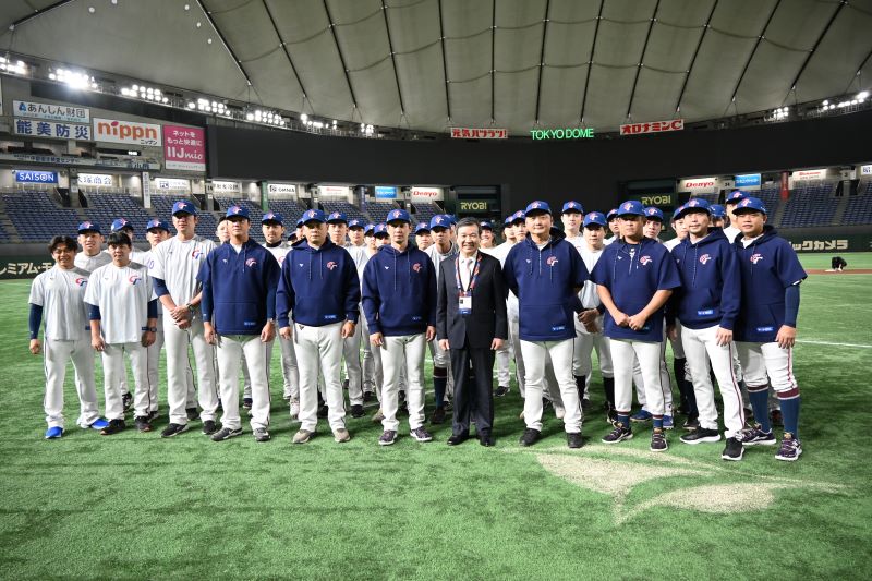 李逸洋・駐日代表は11月20日午後、東京ドームを訪れ、2024年「プレミア12」野球大会2次リーグに出場した台湾代表チームを激励した。写真:台湾代表チーム選手らの激励に訪れた李逸洋・駐日代表(前列右5)。