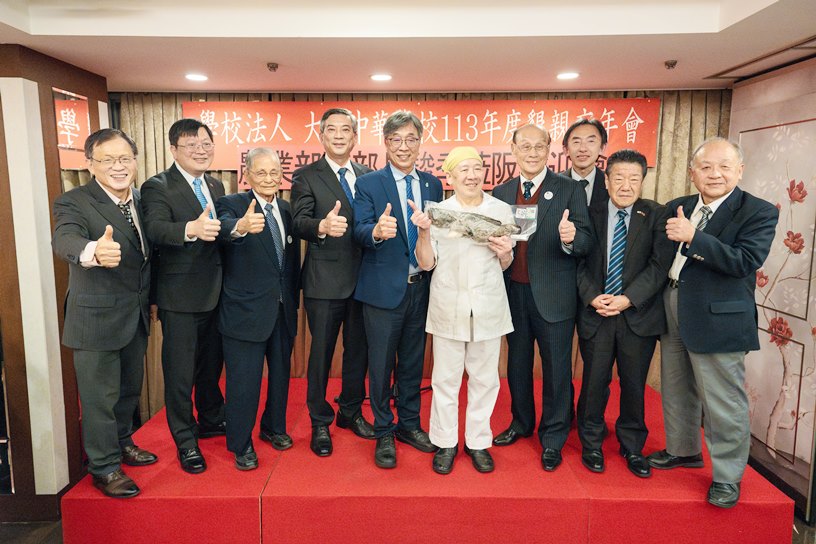 陳駿季・農業部長(照片左5)、周学佑・駐日副代表(左4)、洪英傑・駐大阪弁事処処長(左2)、連茂雄・大阪中華学校理事長(右4)、陳隆慶・「中華料理大東洋」総料理人(右5)。