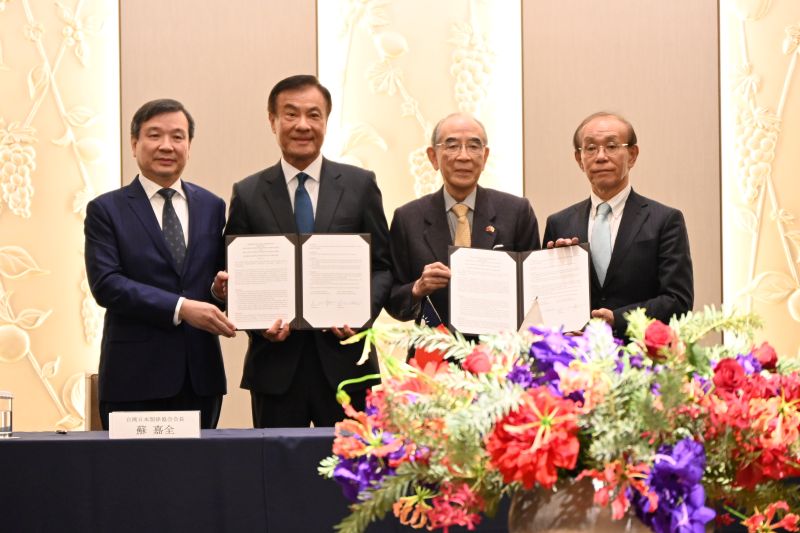 李逸洋・駐日代表(写真左1)と谷崎泰明・日本台湾交流協会理事長(右1)が立ち会うなか、蘇嘉全・台湾日本関係協会会長(左2)と大橋光夫・日本台湾交流協会会長(右2)が「台日植物品種の審査に関する協力覚書」に調印。