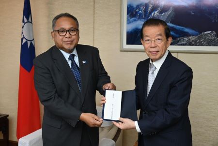ピーター・アデルバイ駐日パラオ共和国大使(左)より台湾花蓮震災義援金が謝長廷・駐日代表(右)に手渡された。