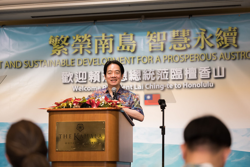 頼清徳総統は11月30日午後、中華民国台湾と正式な外交関係を持つマーシャル諸島、ツバル、パラオ共和国など太平洋の島しょ国を訪問する6泊7日の外遊に向けて出発した。写真は往路で立ち寄ったハワイ・ホノルルでの歓迎晩さん会の様子。