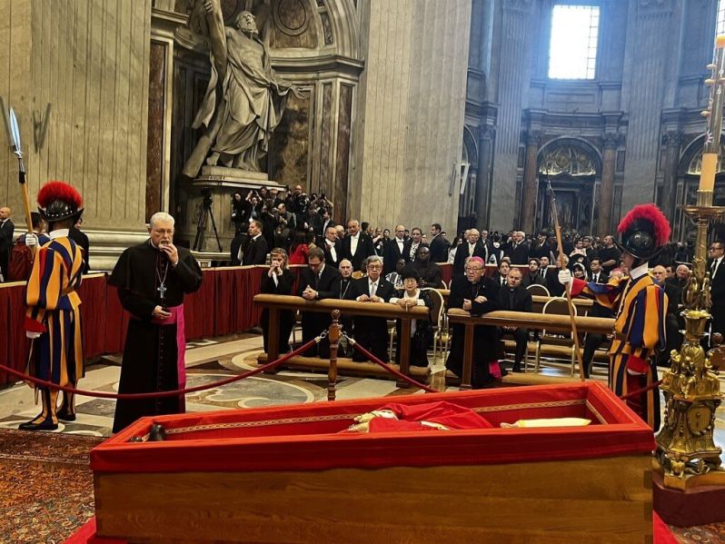 写真提供:在バチカン中華民国大使館フェイスブックより ローマ・カトリック教会のフランシスコ教皇の葬儀が26日午前10時(台湾時間午後4時)より、バチカンのサンピエトロ広場で営まれた。台湾からは陳建仁元副総統が総統の特使として参列した。写真は葬儀前日の25日、サンピエトロ大聖堂に安置されているフランシスコ教皇の遺体と対面し、祈りを捧げる陳建仁氏ら台湾の特使団一行。