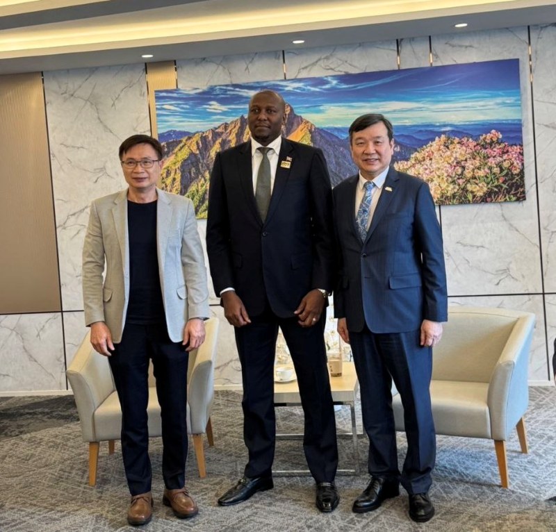 李逸洋・駐日代表(右)、エスワティニ王国のラッセル・ドラミニ首相(中央)、黄志芳・台湾貿易センター董事長(会長)(左)