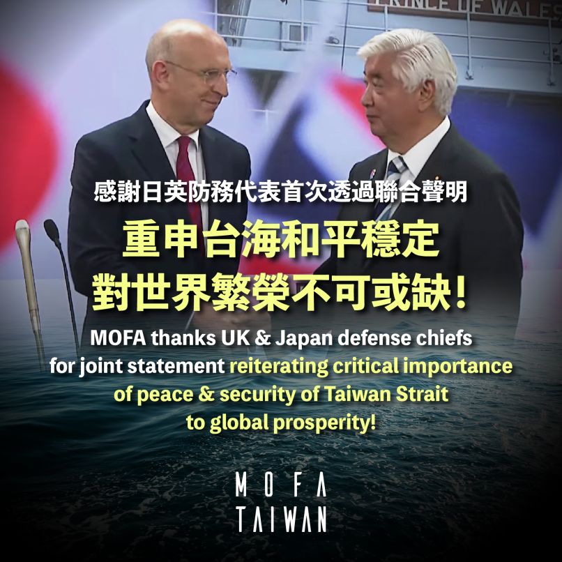 写真提供:外交部 日英防衛相会談のあとに発表された共同声明で、日英防衛相は台湾海峡の平和と安定の重要性を改めて確認した。