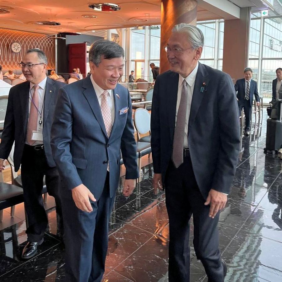 東京羽田空港から台湾訪問に出発する古屋圭司・日華懇会長(右)