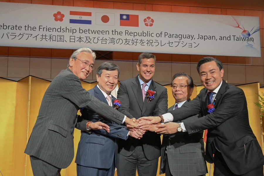 2025年5月に東京で開催された「パラグアイ共和国、日本及び台湾の友好を祝うレセプション」。李逸洋・駐日代表(左2)、古屋圭司・日華懇会長(左1)、パラグアイのサンティアゴ・ペニャ大統領(中央)