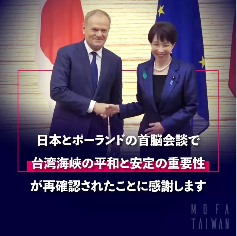 日本の高市早苗首相は15日、東京においてポーランドのドナルド・トゥスク首相と首脳会談を行った。また、会談後に発表された共同声明で、台湾海峡の平和と安定の重要性を再確認し、建設的な対話を通じた両岸問題の平和的解決を促した。日本とポーランドが共同声明という形で台湾海峡情勢を重視する姿勢を示すのは初めてのことであり、外交部の林佳龍部長(外相)は、これを高く評価するとともに、「歓迎する」とコメントした。また、この件に関する中華民国(台湾)外交部のプレスリリースは以下のとおりである。