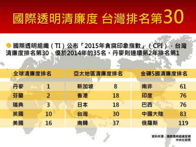 世界の汚職や腐敗を監視するドイツのNGO、「トランスペアレンシー・インターナショナル(TI)」が27日発表した2015年の「腐敗認識指数(CPI)」によると、台湾の「清潔度(最高100ポイント)」は62ポイントで世界30位と、前年の35位から前進した。1位のデンマークは2年連続トップで、満点100ポイントのうち91ポイントを獲得した。