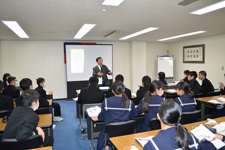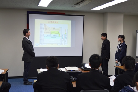 駐日代表処の林世英・教育組副部長が、映写機を用いて、中華民国の成り立ちと国旗、台湾の地理と歴史、台北駐日経済文化代表処の役割、台湾の学校制度などについて説明し、そのあと生徒らから事前に提出された質問に答えた。