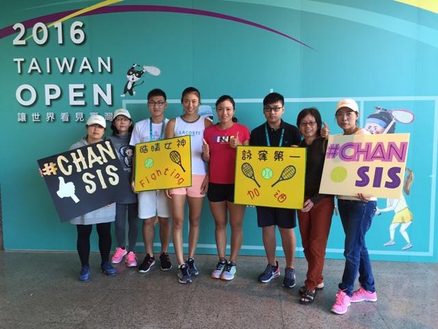 写真提供:中央社 高雄市で開かれた台湾WTAオープンで14日、ダブルス決勝戦が行われ、台湾の詹詠然選手(右から4人目)と詹皓晴選手(左から4人目)の詹姉妹が優勝した。写真は決勝進出を決めた後にファンらと