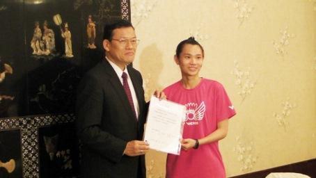 中華民国(台湾)の女子バドミントン、戴資穎(タイ・ツーイン)選手(右)が10日、「マレーシアオープン」女子シングルスで準優勝を果たした。スーパーシリーズプレミアでの準優勝は自己ベスト。中華民国(台湾)のマレーシア駐在代表処の章計平代表(左)は戴選手をねぎらうと共に、教育部体育署(日本のスポーツ庁に相当)から送られてきた祝電を手渡した