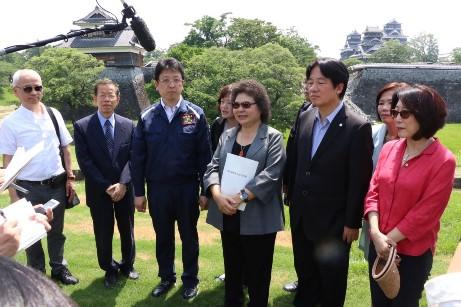 6月11日、熊本城の被災状況の説明を受ける謝長廷・駐日代表(左2)、陳菊・高雄市長(前列右3)、頼清徳・台南市長(前列右2)ら一行