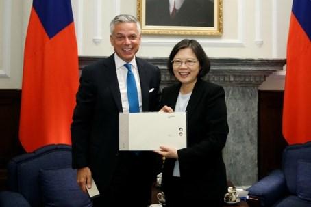 蔡英文総統(右)は22日午前、米国のシンクタンク、大西洋協議会(The Atlantic Council)のジョン・ハンツマン会長(左)が率いる訪問団一行による表敬訪問を受けた。蔡総統は、一行が今後も引き続き台湾を支持し、台米関係をより深化させ、さらにレベルアップさせることを期待すると述べた。
