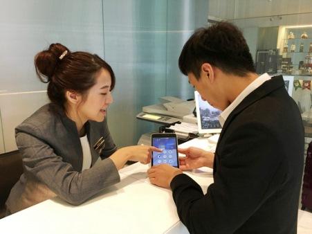 写真提供:中央社 ホテルの従業員から観光客用タブレット「智遊島」の使用説明を受ける観光客。