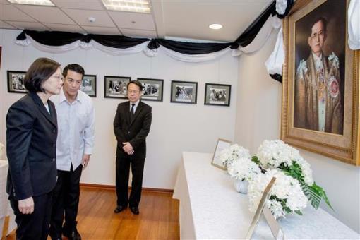 蔡英文総統は17日午前、中華民国(台湾)におけるタイの大使館に相当するタイ貿易経済弁事処を訪ね、李大維外交部長(外務大臣)及びタイのPiroon Laismit駐中華民国代表による案内の下、先ごろ死去したタイのプミポン国王の遺影の前で哀悼の意を表した。