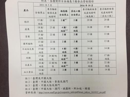 行政院によると、2011年3月11日に発生した東日本大震災による福島第一原子力発電所事故を受け、衛生福利部(日本の厚生労働省に類似)は国民の健康を守るため、日本の福島県、茨城県、栃木県、群馬県、千葉県の5県産の食品の輸入を直ちに停止した。日本では原子力発電所の事故後、これらの地域における食品の生産や製造に関する管理を強化しており、世界の多くの国々がすでに全面的、あるいは条件付きで、これら県産の食品輸入規制を解除している。