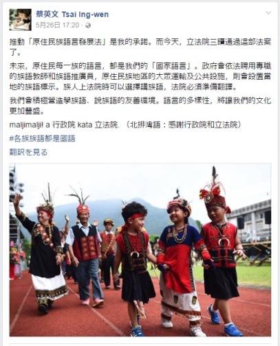 立法院院会(国会本会議)は26日、「原住民族語言発展法(=先住民族言語発展法)」を可決し、先住民族の言語を「国家言語」とすることを法律で定めた。蔡英文総統は同日、自身のフェイスブックページに「言語の多様性は、我々の文化をより豊かにしてくれるだろう」と書き込んだ。