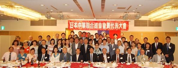謝長廷・駐日代表(前列中央)、張仁久・駐日副代表(前列右6)、郭仲熙・駐日副代表(前列左6)、新垣旬子・日本中華聯合総会会長(前列左5)、毛友次・日本中華聯合総会前会長(二列目左9)