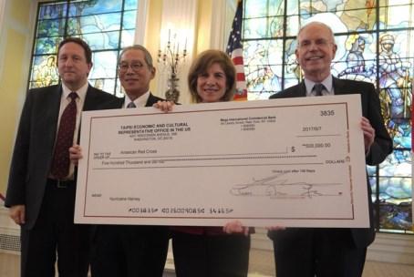 台北駐米経済文化代表処(米国における中華民国大使館に相当)の高碩泰代表(=大使、左から2人目)は12日、大型ハリケーン「ハービー」の被災地支援として義捐金50万米ドルを米国赤十字社に寄付した。写真右は米赤十字社のゲイル・J・マクガバン(Gail J. McGovern)会長、右から2人目はAITのジョン・ノリス(John Norris)執行理事、左は米国務省東アジア・太平洋局台湾事務調整所のJim Heller所長。