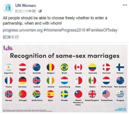 UNウィメンは4日、フェイスブックページに「All people should be able to choose freely whether to enter a partnership, when and with whom!(=あらゆる人々が、いつ、誰とパートナーシップを結ぶかを、自由に選ぶことができるようにすべきです)」という投稿と共に、法律で同性婚が認められている国々の国旗のアイコンが描かれた図を掲載した。この図にはドイツ、フランス、ニュージーランド、オーストラリア、米国、英国などと共に、中華民国の国旗も掲載された。国連機関が発表する資料に中華民国の国旗が掲載されるのは非常に珍しいこと。しかし、そこに表記されていたのは「Taiwan Province of China(台湾 中国の1つの省)」の文字だった。