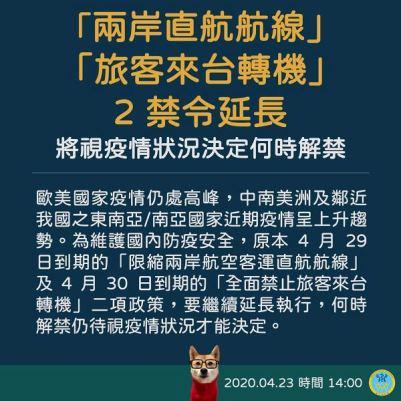 写真提供:衛生福利部フェイスブック 中央感染症指揮センター(新型肺炎対策本部に相当)は、当初4月29日までとしていた「台湾-中国線の縮小」と、4月30日までとしていた「台湾での乗り継ぎ全面禁止」の2つの措置を継続することを決めた。解禁日は新型コロナウイルスの感染拡大の状況を見て判断する。