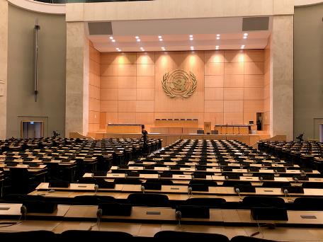 中華民国(台湾)と正式な外交関係を持つニカラグア、パラオ、エスワティニ、セントルシア、マーシャル諸島がこのほど、それぞれWHOのテドロス事務局長に書簡を送り、台湾をオブザーバーとしてWHO総会に招請するよう求めた。写真は2019年に撮影したWHO総会の会場。
