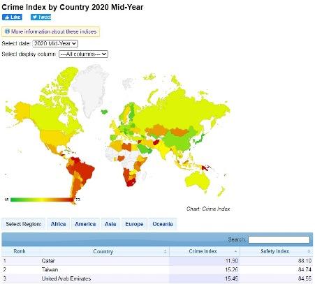 写真提供:サイト「NUMBEO」スクリーンショット 世界各都市の物価・交通・犯罪率などをデータベース化したサイト「NUMBEO」が13日、世界133か国・地域を対象にした2020年中間期の「世界犯罪指数/安全指数ランキング(Crime/Safety Index)」を発表した。その結果、台湾の安全指数はカタールに次ぐ世界2位だった。3位はアラブ首長国連邦。