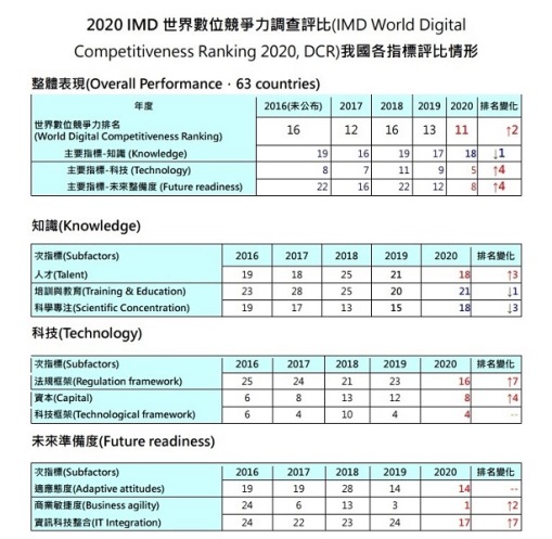 国家発展委員会(日本の省レベル)によると、台湾は評定項目のうち7つの細目で世界上位3位に入った。そのうち「会社の機敏性(Agility of companies)」、「モバイルブロードバンド加入者(Mobile Broadband subscribers)」、「IT&メディア関連企業の時価総額(IT & media stock market capitalization)」は世界1位。「総人口に占めるR&D人員の比重(Total R&D personnel per capita」、「商機と脅威に対する企業の反応速度(Opportunities & threats)」、「スマートフォン普及率(Smartphone possession」」は2位。「高等教育の成果(Higher education achievement)」は3位といずれも高く評価された。