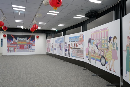今回の展覧のテーマは漫画家の左萱氏がデザインを担当し、きめ細やかで温かい筆使いで廟前の夜市、蚵仔煎(牡蠣の台湾風お好み焼き)、炒め物など日本人が台湾で必ず食べるグルメ屋台などを描き、インスタ映えする「台湾漫画夜市」の空間を作り出し、さまざまな台湾オリジナル漫画とともに「夜市を散歩しながら物語を楽しむ」という体験を楽しんでもらえるようにしている。