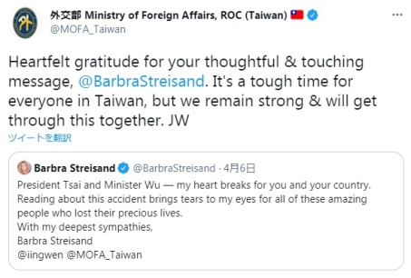 写真提供:外交部 花蓮県で発生した特急列車「太魯閣号(タロコ号)」の脱線事故に関し、4月6日正午までに97の国と国際組織の合計846名からお見舞いのメッセージが寄せられている。写真は米国の女優兼歌手であるバーブラ・ストライサンドさんからのメッセージと、それに対する外交部のリツイートのスクリーンショット。