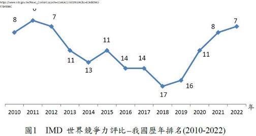 写真提供:国家発展委員会サイトより IMD(国際経営開発研究所)が発表した2022年度「IMD世界競争力年鑑」で、台湾は評価対象となった63カ国・地域の中で7位となった。台湾は4年連続で順位を上げている。写真は2010年以降の台湾の世界競争力ランキングの推移を示すグラフ。