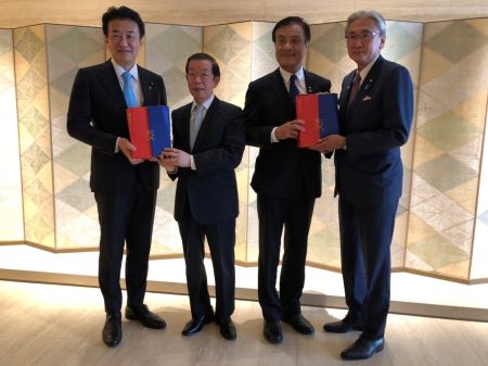 写真右より古屋圭司・日華議員懇談会会長、蘇嘉全・台湾日本関係協会会長、謝長廷・駐日代表、木原稔・日華議員懇談会事務局長