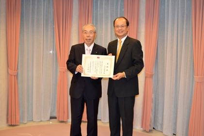 川田達男・福井県商工会議所連合会会頭の台日経済交流への貢献に表彰状を贈呈