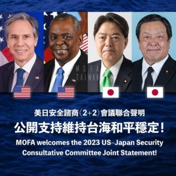 米国のアントニー・ブリンケン国務長官及びロイド・オースティン国防長官と、日本の林芳正外務大臣及び浜田靖一防衛大臣による日米安全保障協議委員会(日米「2+2」)が11日、米ワシントンD.C.で行われ、会議後の共同声明では台湾海峡の平和と安定を守ることの重要性に改めて言及したばかりでなく、「(台湾海峡の平和と安定は)国際社会の安全と繁栄の維持に不可欠な要素」と強調した。外交部はこれについて、日米の政府が再び公の場で台湾海峡の平和と安定の維持を支持したものとして高度に歓迎し、評価する。