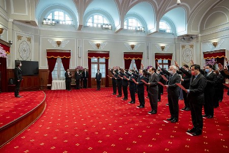 蔡英文総統が1月31日午前、新閣僚就任の宣誓式典を執り行った。陳建仁新任行政院長(=新首相)が他の新閣僚らを率いて宣誓の言葉を述べ、蔡総統が一人ひとりとあいさつを交わした。式典には頼清徳副総統、許宗力司法院長、黄栄村考試院長、陳菊監察院長、国家安全会議の顧立雄秘書長らが立ち会った。