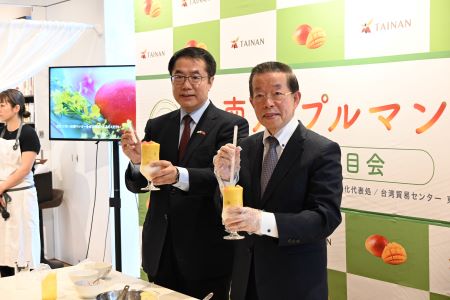 謝長廷・駐日代表が黄偉哲・台南市長とともに台湾台南市産マンゴーをPR