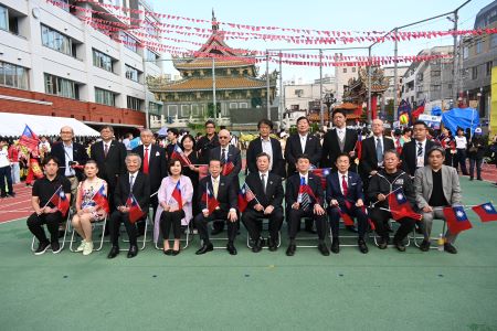 横浜中華学院で開催された中華民国112年祝賀式典。謝長廷・駐日代表(前左5)、張淑玲・駐日代表処横浜分処処長(前左4)、許耀庚・横浜華僑総会会長(前右5)、羅鴻健・日本中華聯合総会会長(前右4)