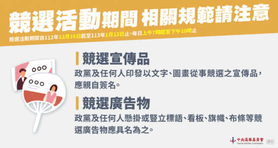 写真提供:中央選挙委員会 2024年1月13日に投開票される第16代正副総統選挙が15日に告示された。これに伴う選挙運動期間は12月16日から来年1月12日までの28日間、毎日午前7時から午後10時までとなる。写真は選挙運動期間の注意事項を記載したもの。