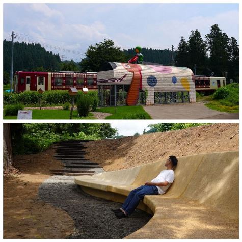 新潟県で開催している「大地の芸術祭」で見られるジミーさんの絵本の世界を再現したかまぼこ型倉庫(写真上段)と田中央工作群と田熊隆樹氏による空間設計のベンチ(同下段)。会期は11月10日まで。