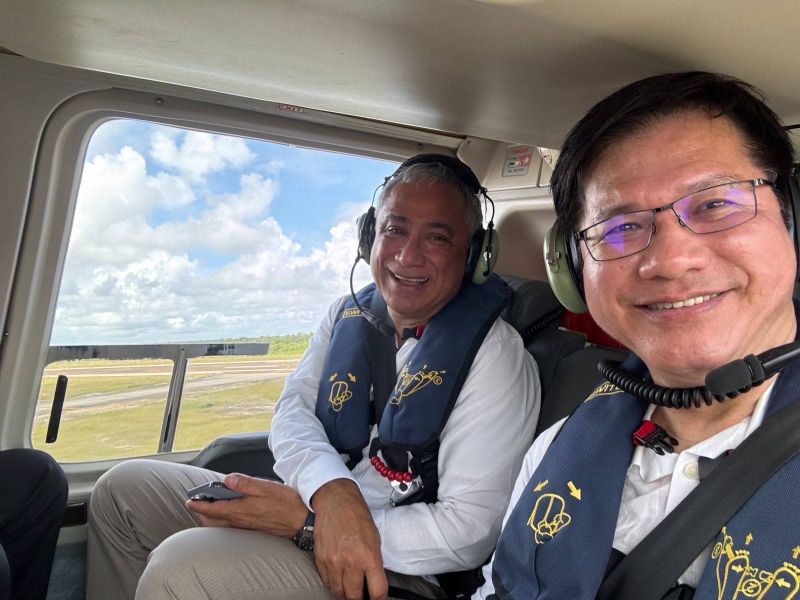 外交部の林佳龍部長(外相)は10月29日と30日の両日、中米の国交樹立国、ベリーズを訪れた。写真は30日、ブリセーニョ首相(左)とヘリコプターに同乗し、海洋保護区を観賞した林部長(右)。